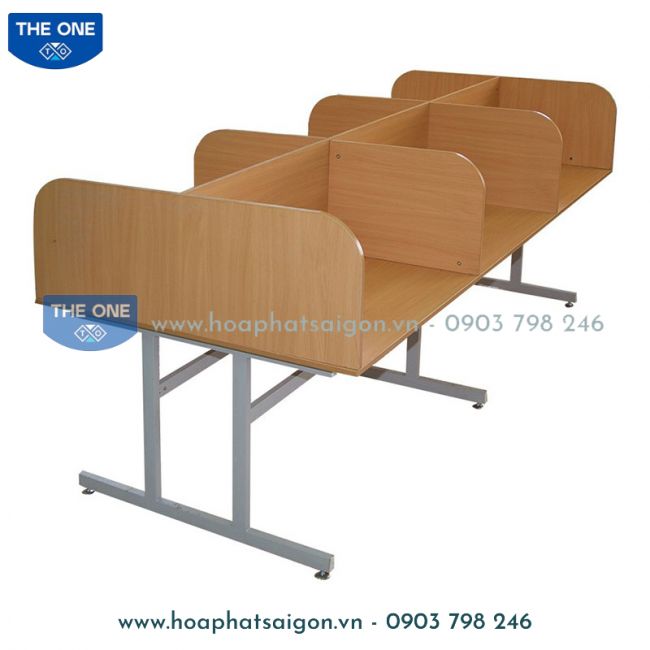 Bàn đọc thư viện khung thép mặt gỗ Melamine, có vách ngăn gỗ trên mặt bàn.