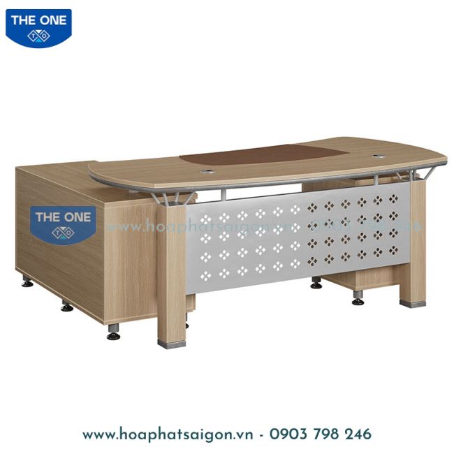 Bàn lãnh đạo gỗ Melamine, mặt bàn lượn cong có ốp gỗ sơn trang trí ở phía dưới.