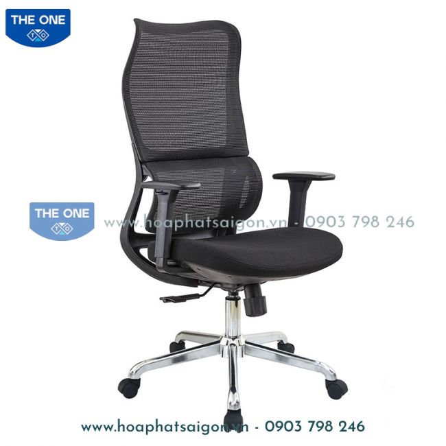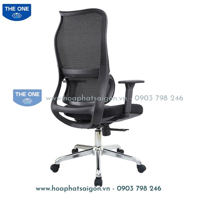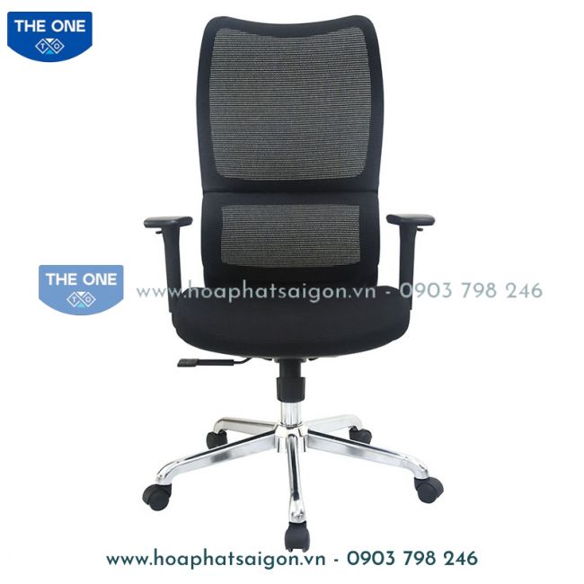 Ghế công thái học, đệm mút đúc bọc vải, tựa nhựa bọc vải lưới, tay ghế bằng nhựa có thể điều chỉnh cao thấp.