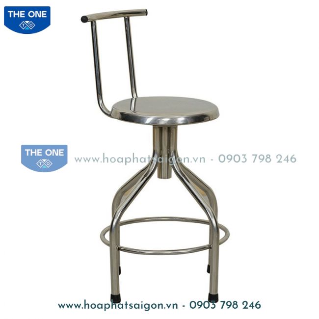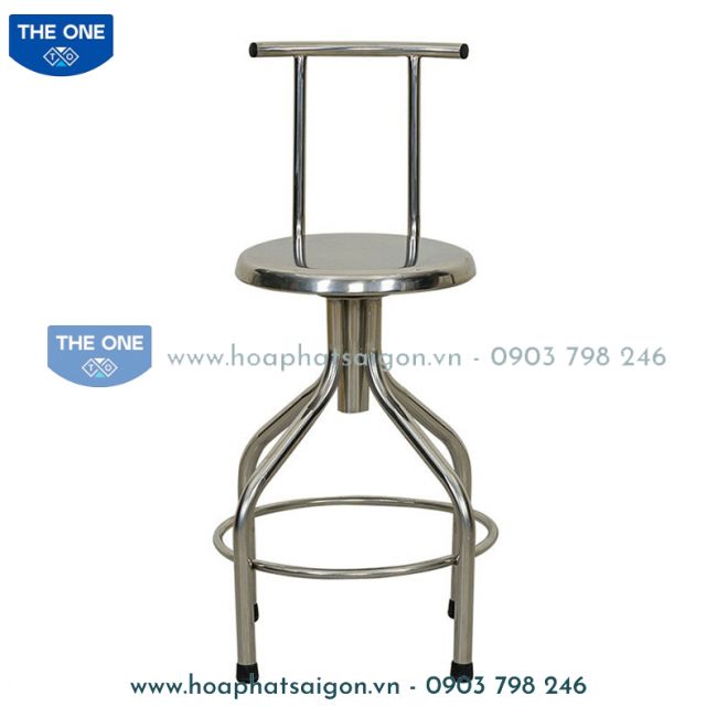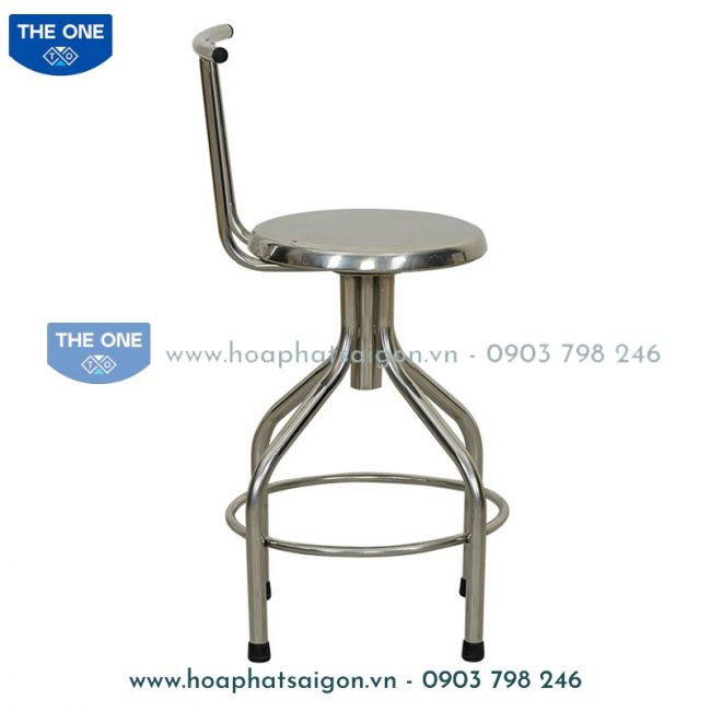 Ghế đẩu quay khung Inox, điều chỉnh được độ cao. Có tựa lưng.