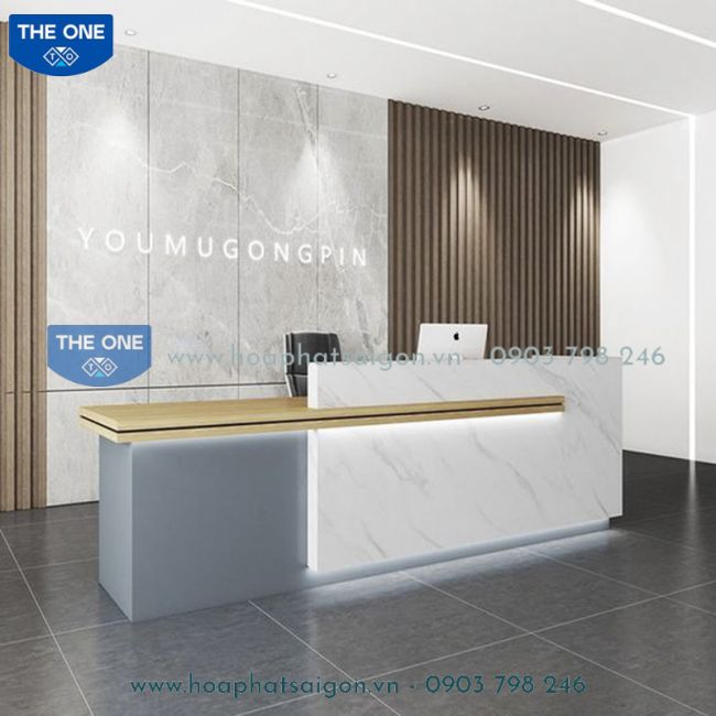 Quầy gỗ công nghiệp phối màu vân đá hiện đại chân quầy có đèn Led rọi trang trí.