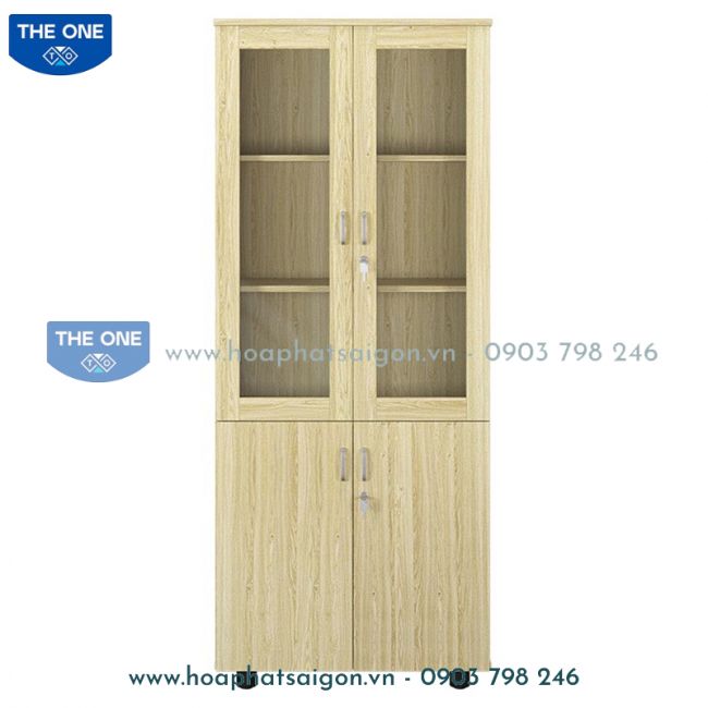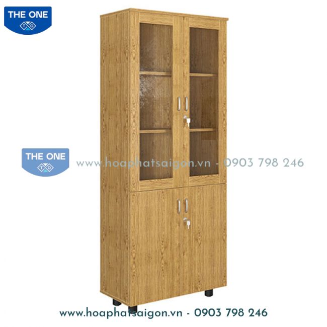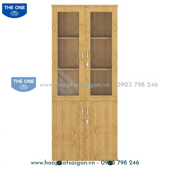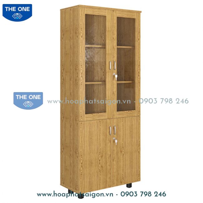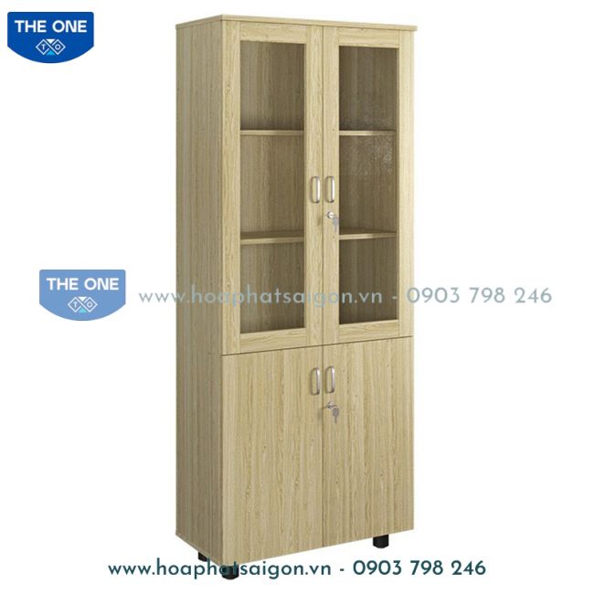 Tủ tài liệu 2 khoang gỗ melamine, phía trên là 2 cánh khung kính để tài liệu, phía dưới 2 cánh mở.