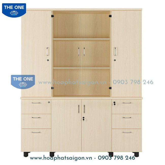 Tủ tài liệu 4 khoang, khoang trên có 2 cánh kính giữa để tài liệu, hai bên cánh đặc.